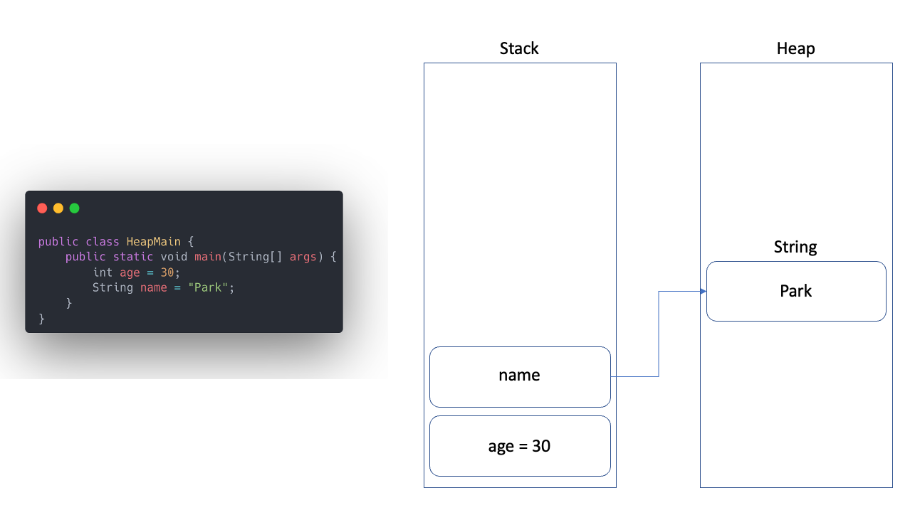 Stack 영역에 생성된 name 변수는 Heap 영역에 있는 String 주소값을 참조하게 된다.