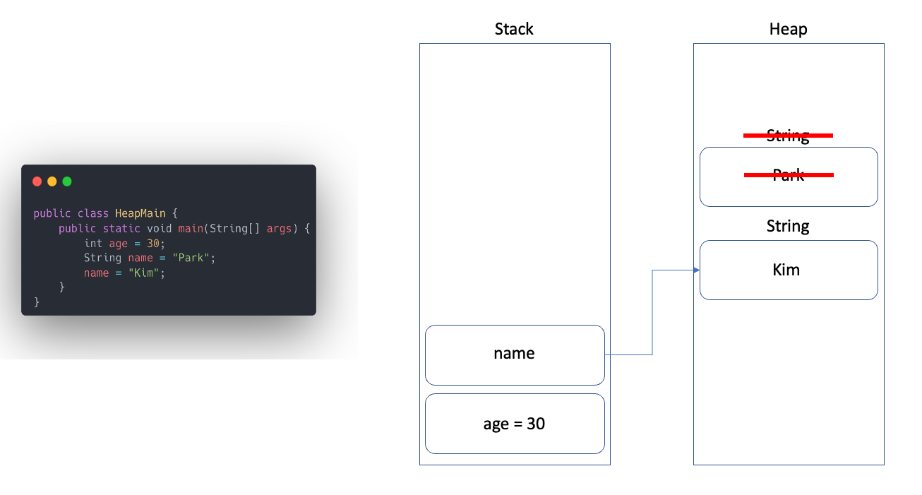 조금 더 나아가서 name을 Park에서 Kim으로 변경하면 새로운 String("Kim")의 주소값을 참조하게 되며, 기존에 생성되어지고 더 이상 사용하지않는 String("Park")은 자바의 GC(Garbage Collection)에 의하여 제거된다. (추후 GC에 대해 정리 후 업로드)